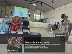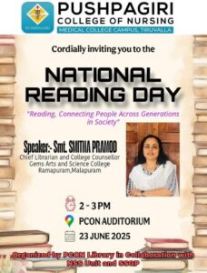 The Reading Day Celebration Programme was organized by the college library in collaboration with NSS and SSGP on June 23, 2025, at the college auditorium. The programme started at 2 p.m. with a prayer song, followed by a welcome speech by M/S. Divya Ann Saji, 7th Semester BSc. (N) Student. The programme was inaugurated by Mrs. Vineetha Jacob, Principal PCON followed by inaugural address. Smt. Smitha Pramod, Cheif Librarian & College counselor, GEMS Arts & Science College, Ramapuram, Malappuram was our chief guest and resource person. Madam delivered a session on the reading day theme 2025 ‘ Reading, Connecting People Across Generations in Society”. She presented sweet and enthusiastic words highlighting the importance of reading connecting with our daily life. The best library user award is a recognition given to MS. Ans Manoj, second semester BSc. Nursing students who make the most effective use of library resources. The winner received a cash prize of Rs. One thousand and a book authored by Nimna Vijay. The memento gifted as a token of gratitude to the resource person by Ms. Swapna J, Asst. Librraian. Followed by vote of thanks by Mrs. Jeena N. Nair, Librarian, PCON. The programme ended around 3.15 p.m. with a national anthem.