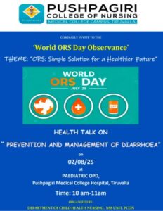World ORS Day is observed every year on July 29 to raise awareness about the importance of Oral Rehydration Solution (ORS) in preventing and treating dehydration, especially during diarrhoeal illnesses. The day promotes the widespread use of ORS as a simple, cost-effective, and accessible intervention that can save lives when used correctly. Child Health Nursing department and NSS unit of Pushpagiri College of Nursing jointly observed world ORS day on 02/08/25 at Paediatric OPD. Sixth Semester B.Sc.Nursing students conducted an awareness program on prevention and management of diarrhoea with the help of a role play. A total of 25 students, 3 teachers from child health nursing department and 25 patient bystanders were present for the program. The program helped to create an awareness to the public regarding the importance of ORS and prevention management of diarrhoea in children.